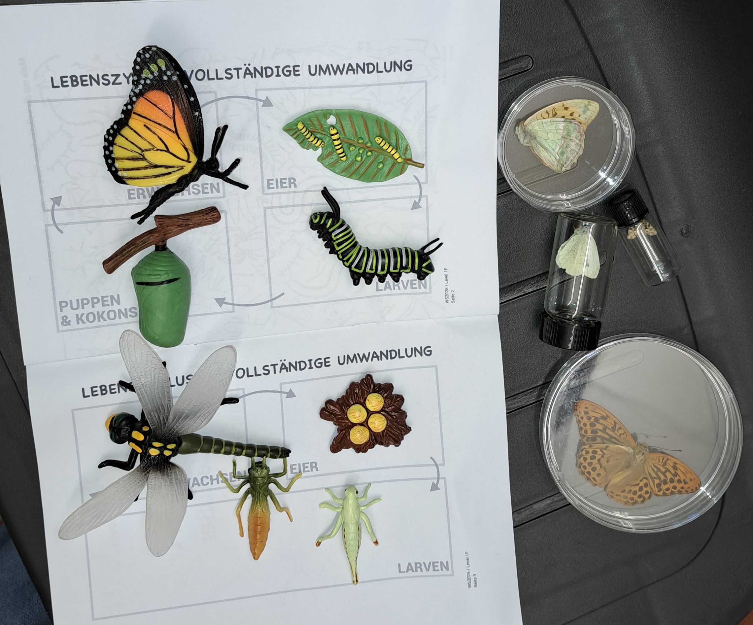 Mit Tastspielen, bei welchen Spinnentiere, Krebstiere, Käfer, Schmetterlinge, Hautflügler, Zweiflügler, Schnabelkerfe, Heuschrecken und Vielfüßer „begriffen“ wurden, konnte den Teilnehmenden der Unterschied erklärt werden. Es wurde auch ein Exhaustor (Insektenstaubsauger) gebaut, mit dem die eingesammelten Tiere genau beobachtet wurden. Selbstverständlich wurde vorher erklärt, wie man mit lebenden Insekten umgeht – ohne sie zu verletzen oder zu erschrecken.