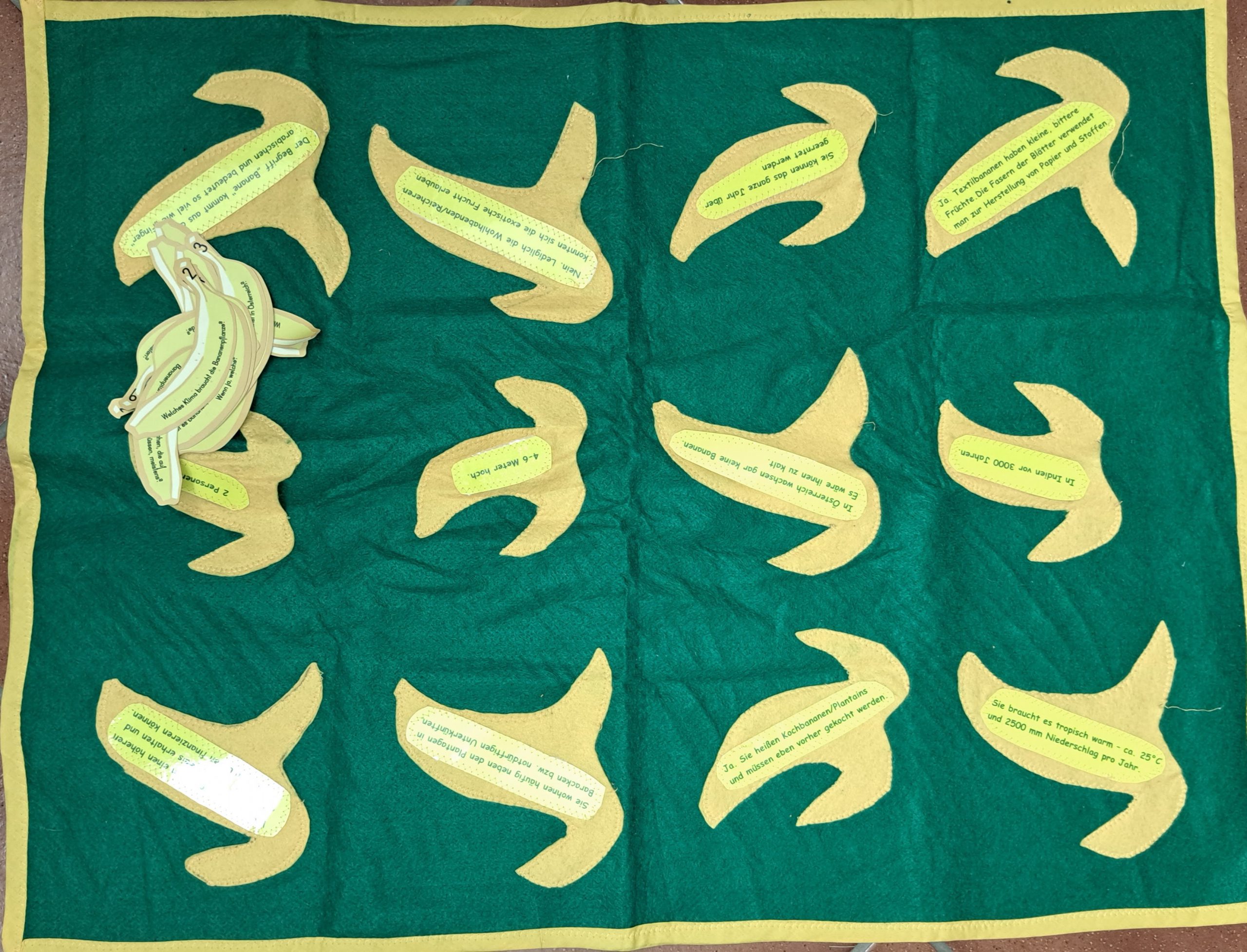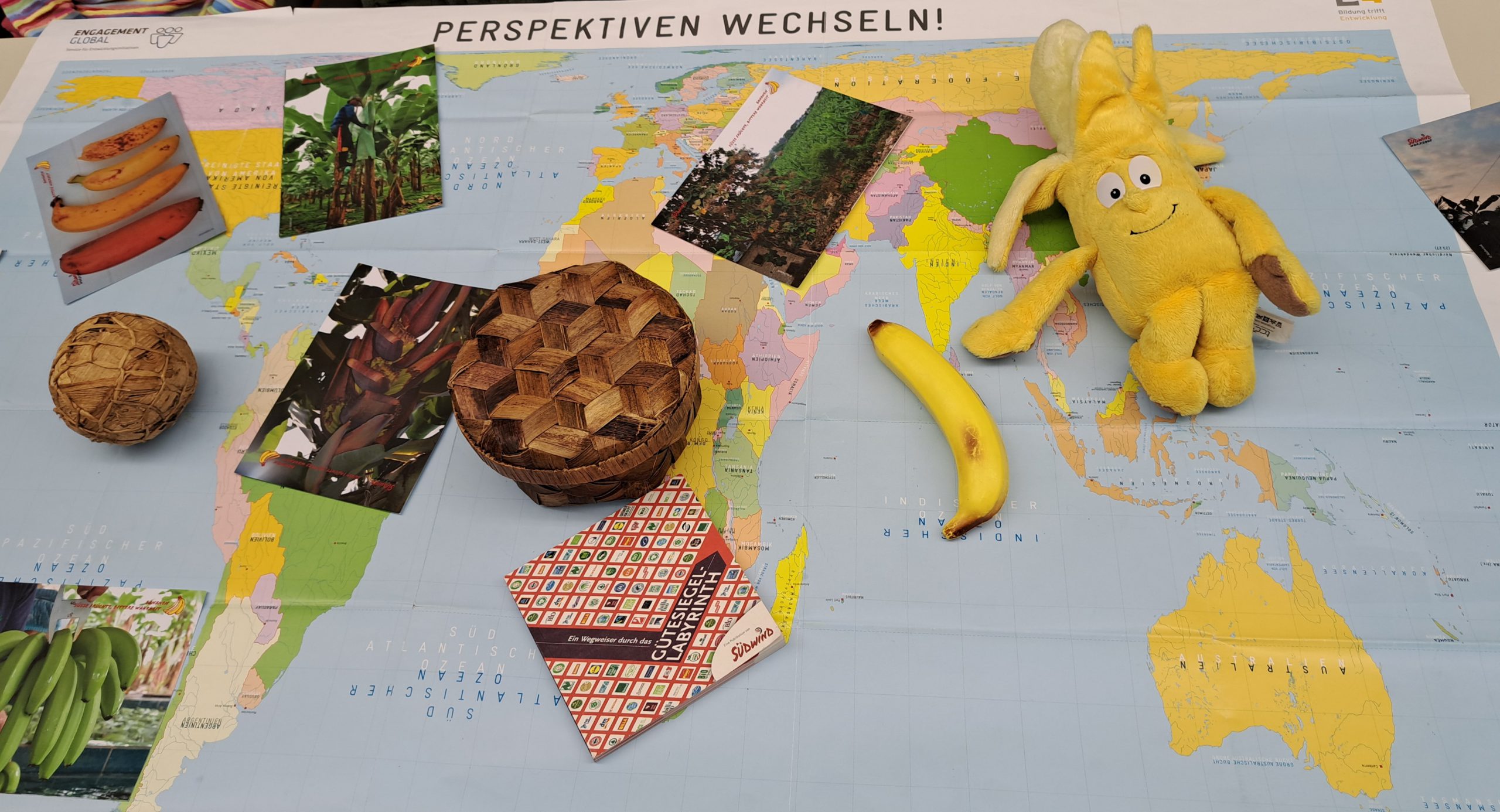 Die Banane – sie schmeckt immer und überall. Als Pausensnack leistet sie jede Menge für Nerven und Gesundheit. Über ihre Geschichte, Herkunft und das Leben der Plantagenarbeiterinnen und Plantagearbeiter ist allerdings wenig bekannt. Wie kam die Banane nach Europa und was ist eine „bio-faire“ Banane? Dies wurde mittels Landkarte und Quiz erklärt und außerdem wurden Snacks aus Bananen zubereitet.